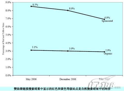 自 2006 年 5 月的研究以来,赞助商链接(付费广告)搜索结果的安全性有所提高。链接到危险站点的赞助商链接搜索结果百分比从 2006 年 5 月的 8.5% 下降到 2007 年 5 月的 6.9%。但这也表明,赞助商链接搜索结果的危险性仍然较高,其红色和黄色等级的站点数是自然搜索结果的 2.4 倍。