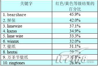 与音乐和技术相关的关键字仍居最危险的搜索词之列。比较 Google Zeitgeist 各类别搜索词的安全性,“数字音乐”(含搜索词“免费音乐下载”、“BT 下载”和“itunes”)类别返回的危险站点比例最高,达 19.1%。“在线活动”类别(含“聊天”、“壁纸”等在线活动关键字)的返回结果中,危险站点的比例为 17.5%。