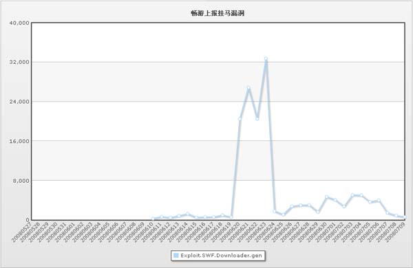 网络电视软件UUSee在刚出现短短几周的时间已经超过了MS06014。以此可见,网马的时效性也很强,尤其是一些0day网马,会在漏洞修补前被广泛利用。超级巡警团队在6月18日捕获利用UUSee 0day漏洞的网马,在通知了软件厂商后,立即发布了预警资讯。6月19日,该类网马的上报量在一天时间内竟达到近5万条,如下图: