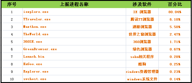 2009年上半年,瑞星“云安全”数据中心还记录了访问挂马网站的进程,以及利用不安全进程访问的挂马网站数量。从下图可以看出,使用浏览器访问挂马网站的数量最多,IE名列第一,腾讯TT和遨游紧随其后。
