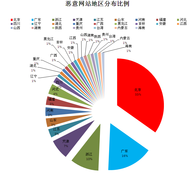 2009年上半年度恶意网站地区分布比例统计如下图,本数据显示恶意网站服务器实际存在的地理位置,以IP地址为准。通常情况下,多个木马网站URL会存在于同一IP地址,因此该数据的量级会远远小于实际的木马网站数量。