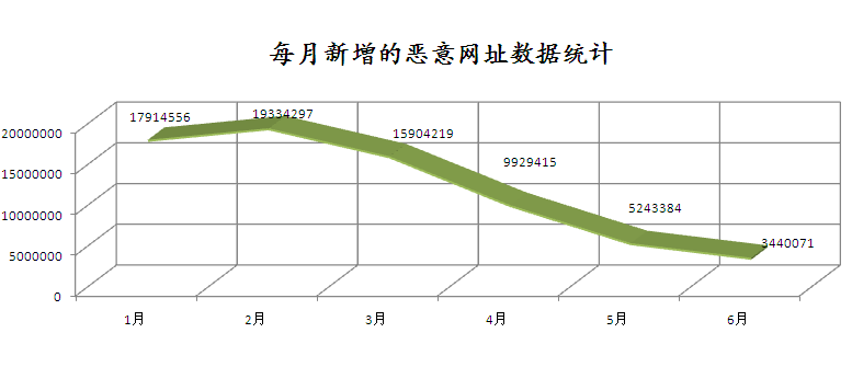 据瑞星“云安全”数据中心2009年上半年数据显示,1月-6月新增的恶意网址数量为71765942个,平均每个月新增的恶意网址数量为11960990个,也就是说每天平均新增被挂马url数量为398699个。