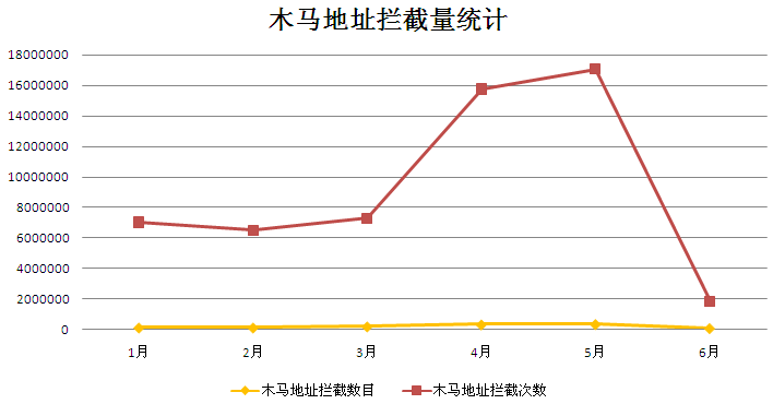 “木马地址”是指可以直接下载木马病毒的URL网址,从瑞星“云安全”数据中心上半年统计看,被拦截的木马地址数目为1196092个,去掉重复地址后的数目是26832个,拦截次数共56143839次。其中6月份被拦截木马地址数量为3601935次挂马减少威胁未减,比5月份有明显下降,挂马减少威胁未减网络安全状况趋于平稳状态。