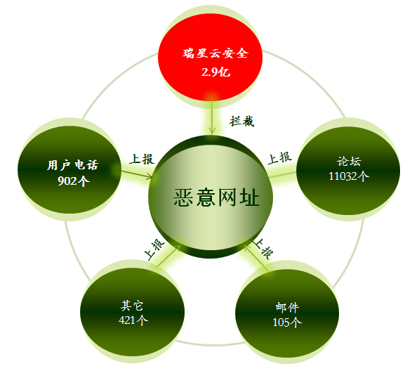 瑞星公司客服中心数据显示,2009年上半年用户通过拨打电话、发送email、论坛提交等方式主动上报的恶意网址总量为12460个(其中电话902个、邮件105个、论坛11032个、其它421个),占瑞星“云安全”系统拦截恶意网址总数的千万分之一。