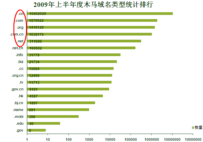 瑞星“云安全”数据中心截获的数据表明,2009年上半年被拦截的木马网站域名类型排行如下图,排名第一是【.cn】,拦截量达10402029次,有 67.8%的木马网站使用CN域名,前五名中排名紧随其后的域名依次为【.com】、【.org】、【.com.cn】、【.net】。