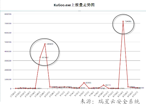 2009年2月25日,瑞星“云安全”监测数据表明,酷狗被挂马,当天截获到KuGoo.exe访问挂马网站的数量为337519,第二天2月26日为 480800,那一次挂马的“寿命”长达两天,直到2月27日才清除了挂马。3月14日通过KuGoo.exe进程访问挂马网站数据量暴增,为 724381,达到平时访问量的30倍之多,那次挂马持续了一天,3月15日被清除恢复正常,当天显示数量下降至18964。