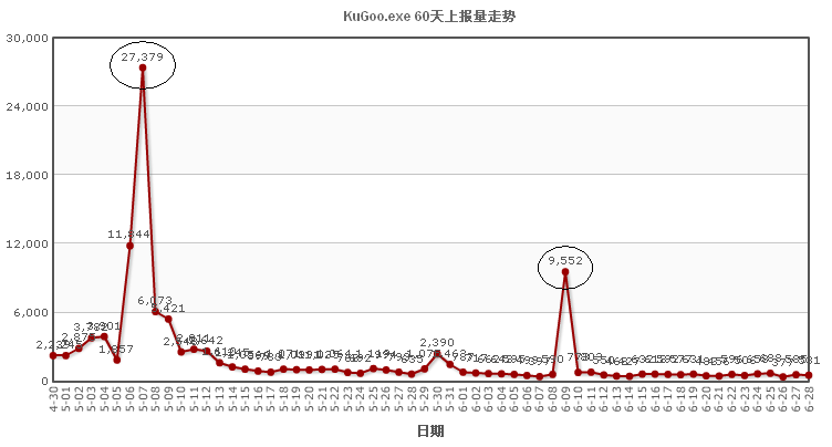 截止到6月29日,“云安全”数据中心显示,酷狗网站在5月7日和6月9日仍有小范围的被挂马行为。(5月7日截获到KuGoo.exe访问挂马网站的数量为27379,6月9日为9552)