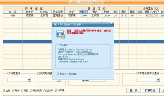 被植入木马的网页为极品时刻表内嵌的广告网页,用户在使用“查询”功能之后,该软件会自动打开那个被挂马的网页。该网页中使用了多个常用软件的流行漏洞,如果用户没有做好相应的防护,很容易中毒。