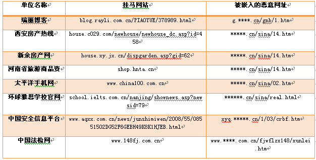2009年4月,据瑞星“云安全”系统统计,本月瑞星共截获了15432616个木马网址,4月24-4.26日共有6,438,943人次的网民遭到网页挂马攻击,瑞星共截获了1,847,811个挂马网址。仅4月24日当天就有2,325,7762人次的网民遭到网页挂马攻击,瑞星截获了681,393个挂马网址。其中博客、房地产、招聘、学校类网站被挂马次数频繁: