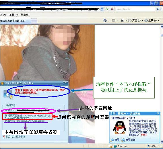 以“海运女艳照”被黑客恶意挂马为例,黑客利用此焦点事件传毒的事件有增多的趋势,如果安装了“瑞星杀毒软件2009”或“瑞星全功能安全软件”,当网民浏览带毒论坛、网站时,瑞星2009会立即提示网页存在恶意代码,并显示病毒名称,如下图。