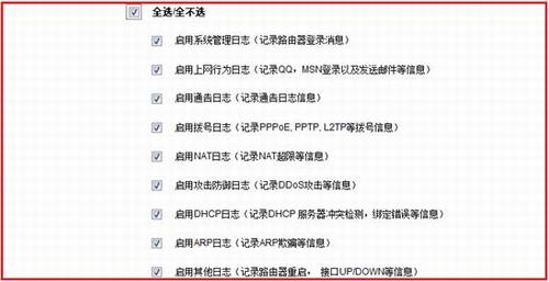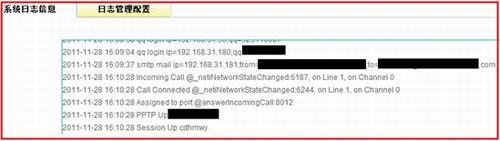 日志管理记录功能可以记录上网行为日志(记录QQ,MSN登录以及发送邮件等信息);登录设备日志;系统拨号日志;系统攻击防御日志;ARP欺骗日志;以及系统通告日志和设备重启等日志信息,可以登录设备实时查看当前系统内容和信息,为系统运行状态的监控和维护提供最有效的信息。