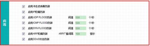 支持内/外网攻击防护功能,可防御冲击波病毒、DDoS攻击、扫描类攻击、ARP病毒、可疑包攻击行为,如:TCP Syn Flood、UDP Flood、ICMP Flood攻击、IP欺骗等。