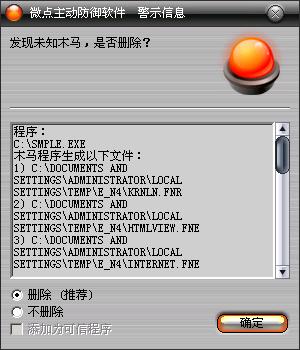 已安装使用微点主动防御软件的用户,无须任何设置,微点主动防御将自动保护您的系统免受该病毒的入侵和破坏。无论您是否已经升级到最新版本,微点主动防御都能够有效清除该病毒。如果您没有将微点主动防御软件升级到最新版,微点主动防御软件在发现该病毒后将报警提示您发现“未知木马”,请直接选择删除处理(如图1);