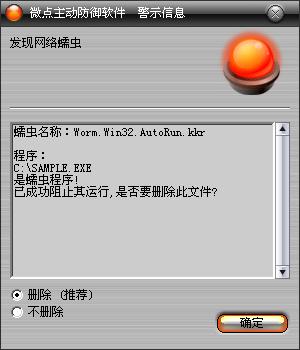 如果您已经将微点主动防御软件升级到最新版本,微点将报警提示您发现“ Worm.Win32.AutoRun.kkr”,请直接选择删除(如图2)。