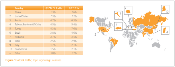 【搜狐IT消息】1月24日消息,据Akamai报告显示,2012年三季度,全球近三分之一的网络攻击来自中国,比二季度翻倍。