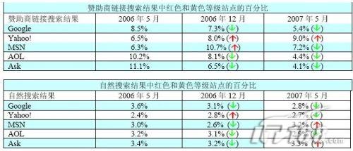 自 2006 年 5 月的研究以来,赞助商链接(付费广告)搜索结果的安全性有所提高。链接到危险站点的赞助商链接搜索结果百分比从 2006 年 5 月的 8.5% 下降到 2007 年 5 月的 6.9%。但这也表明,赞助商链接搜索结果的危险性仍然较高,其红色和黄色等级的站点数是自然搜索结果的 2.4 倍。