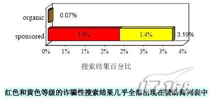 与自然搜索结果相比,赞助商链接搜索结果中诈骗站点(如出售自由软件的网站、带有误导消费性质的铃声网站,以及欺骗性的居家轻松赚钱网站)的比率要高得多。在所有赞助商链接搜索结果中,诈骗站点占 3.2%,而自然搜索结果中只占 0.07%。如果搜索引擎能将诈骗站点排除在赞助商链接搜索结果之外,就可以显著降低用户与这些站点进行交互的几率。测试表明,自从 2006 年 5 月以来,赞助网商链接搜索结果中诈骗站点的百分比已经从 4.1% 降到了 3.2%。