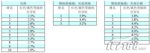 Google 赞助商链接的安全性随链接出现的位置而有所变化。具体而言,显示在 Google 搜索结果最上方的赞助商链接一般都要比列在右侧的赞助商链接更为安全。只有当广告满足特定的条件(未正式公开,但一般认为包含点击率、相关性以及竞价)时,Google 才会把它们置于页面顶端。我们放心地看到,Google 认为质量较高的广告也是 SiteAdvisor 评估中予以肯定的广告。但尽管如此,即便是 Google 放在首位的广告,平均起来,其安全性仍然要低于自然搜索结果。