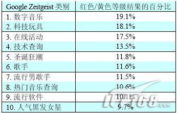 与音乐和技术相关的关键字仍居最危险的搜索词之列。比较 Google Zeitgeist 各类别搜索词的安全性,“数字音乐”(含搜索词“免费音乐下载”、“BT 下载”和“itunes”)类别返回的危险站点比例最高,达 19.1%。“在线活动”类别(含“聊天”、“壁纸”等在线活动关键字)的返回结果中,危险站点的比例为 17.5%。