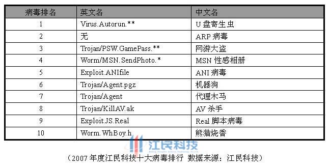 根据江民全球病毒监测网(国内部分)、江民病毒预警中心、客户服务中心等多个部门联合监测统计,综合病毒的破坏能力以及传播范围,江民反病毒中心公布了2007年度十大病毒排行:
