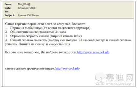俄罗斯黄色垃圾邮件已经存在了一段时间了。俄罗斯黄色垃圾邮件一般含有一个图像和一个垃圾URL链接。“赛门铁克”最近发现俄罗斯黄色垃圾邮件有一个新趋势。垃圾邮件含有发送者的网站和伪造的发送者信息,这是俄罗斯垃圾邮件的一个显着特征。然而,与典型的俄罗斯垃圾邮件不同的是,这种邮件不是提供通常的在线注册服务,而是要求收件人在他们能够进一步往下走之前通过短信发送其注册信息。用户必须遵从,才能接受随后的黄色服务。该垃圾邮件发送者称,通过注册这种短信服务,用户在今后将能接收没完没了的黄色内容。对用户发送的每条短信,他们将收取4.75美元。这就相当于收件人在给垃圾邮件发送者付钱来让他们接收自己的个人信息。