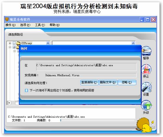 瑞星很早就开始对基于虚拟机的行为分析技术进行研究,并在2003年底将该技术应用到瑞星杀毒软件2004版当中。当时的扫描引擎不仅可以有效地发现DOS及Win9X下的感染型未知病毒,并且还能够安全地清除掉这些未知病毒。