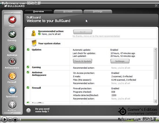 BullGuard称,这款软件以BullGuard Internet Security 8.0为基础,并加入了独特的游戏元素,因此实现了系统安全性与游戏可玩性的完美综合,因此像弹出窗口、自动升级等容易干扰用户游戏的问题将完全不复存在。预先指定的游戏一启动,软件就会切换到游戏优化模式,相应的配置软件里包含独立的防毒杀毒和防火墙设定,确保系统资源优先用于游戏。