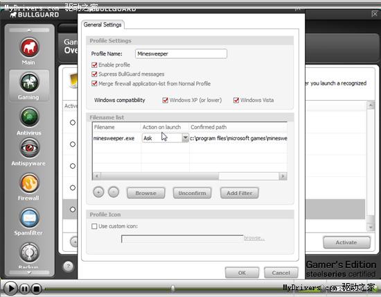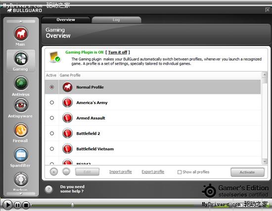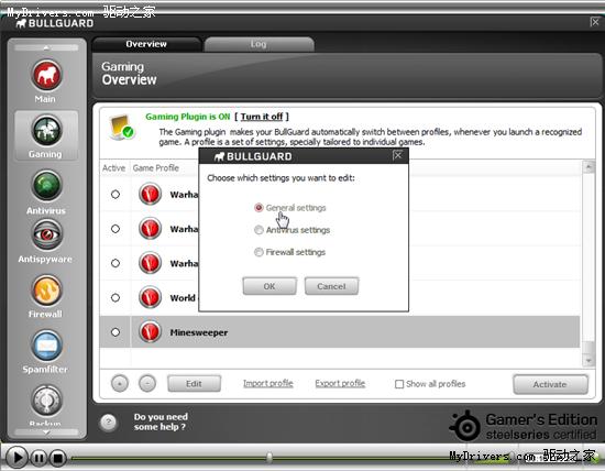 BullGuard Gamer's Edition自带了针对70多款游戏的优化设置,均可直接使用。如果玩家的游戏不在其中,一则可以激活通用游戏模式,二则可以自行创建配置文件。