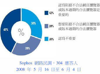 一个管理良好的网页浏览器,修补了漏洞且设定合适的选项,有助于保护企业网络的健全。甚至有70%的系统管理员希望有能力阻挡不合法的网页浏览器,或是阻挡企业内部版本过期的合法浏览器。其中,30%认为浏览器控管不重要的管理员,可能需要重新思考这个问题,因为不合法的浏览器确实会造成安全和生产力的问题。管理员若设定政策来控制员工使用的网页浏览器和版本,便能简化保护网页的工作,尤其在网页上恶意软件活动越来越猖獗的时候。