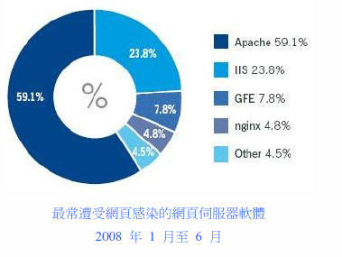 在2008年1月至6月发现的网页型威胁中,有将近60%是感染了Apache伺服器。这个结果比2007年呈现显著的增长,当时只有低于49%的Apache网页伺服器遭受网页型感染。许多Apache伺服器是放置在Linux或UNIX型平台上,这表示恶意软件事实上并不单纯是微软的问题。