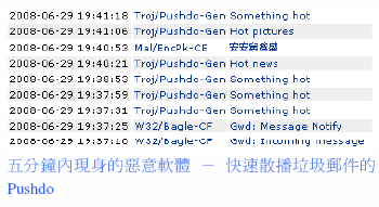 Pushdo在电子邮件附件恶意软件排行榜上迅速攀升,几乎占据了2008年前6个月所有报告的三分之一,而它在2007年的数据中却不见其身影。无论如何,即便Pushdo是排行榜之首,其散播力度仍比不上散播大量邮件的蠕虫,例如在2003和2004年首度现身的Netsky、Bagle和Sobig。