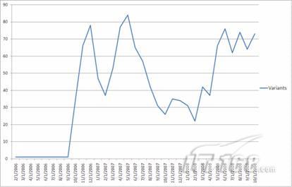 Sinowal木马的创建者会定期发布新的变种,并登记成千上万的互联网域名作为其通信资源。这样做的目的是为了能使木马不间断地掌控受感染的计算机。下图显示了Sinowal木马的创建者创造新变种的速度。