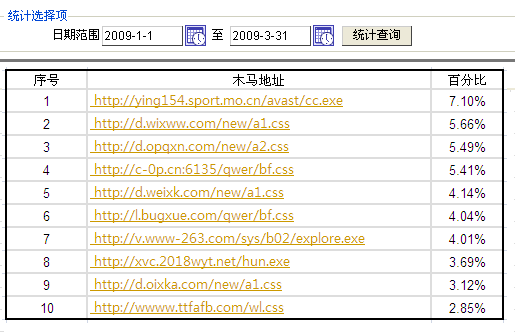 瑞星“云安全”数据中心的统计表明,2009年第一季度截获的挂马网站(网页数量)总数目为197676188个,平均每天截获2196402个;挂马网站攻击总次数800412435次,平均每天遭遇攻击次数达8893471;其中确定是大型网站被挂马的“挂马网站”总数为24202个,平均每天有268个大型网站被挂马,2009-1-7当天拦截的“挂马网站”高达1011个。