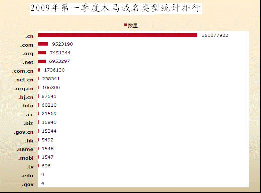 瑞星“云安全”数据中心截获的数据表明,2009年第一季度被拦截的木马网站域名类型排行如下图,排名第一是【.cn】,拦截量竟然高达151077922,前五名中排名紧随其后的域名依次为【.com】、【.org】、【.net】、【.com.cn】。由此可见,这几个域名都是黑客们最热衷“光顾”的。