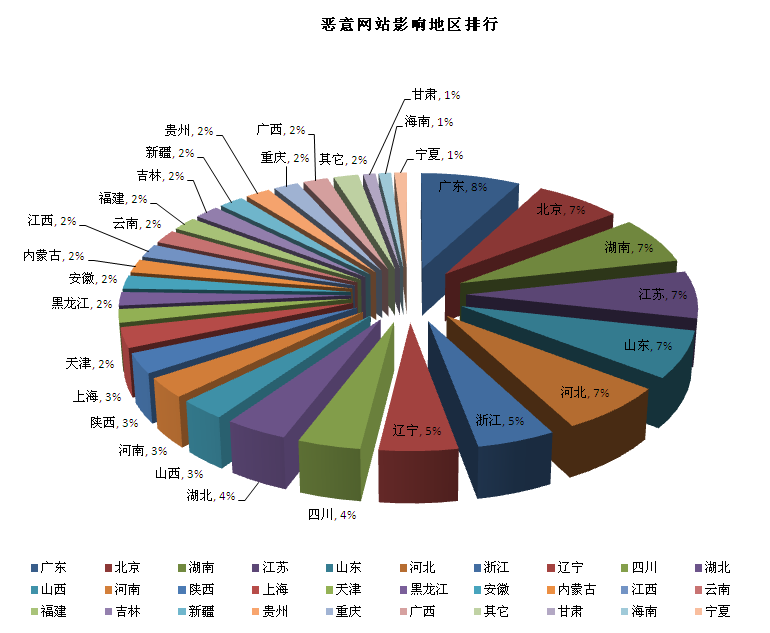 在各省疫情方面,广东省以8%的数量领先,北京、湖南、江苏、山东等省市紧随其后。从统计数据来看,各省网民受恶意网木马网站几乎没有差距,上网计算机保有量是疫情地区差别最重要的原因。