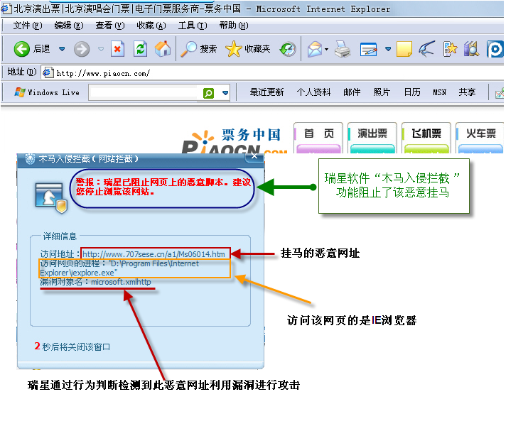 以“票务中国(http://www.piaocn.com/)”被黑客恶意挂马为例,如果安装了“瑞星杀毒软件2009”或“瑞星全功能安全软件”,当网民浏览挂马网站时,瑞星2009会立即提示网页存在恶意代码,并显示漏洞名称,如下图。