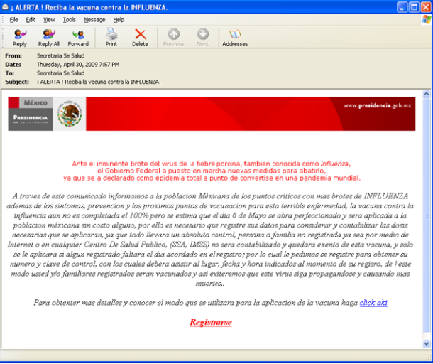 【赛迪网讯】5月4日消息,据国外媒体报道,安全公司SonicWall称,目前有恶意电子邮件利用分发猪流感疫苗的信息,来吸引用户点击一个墨西哥网站的恶意文件,以窃取银行登录信息。