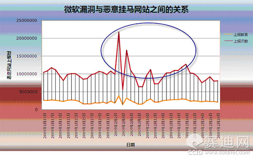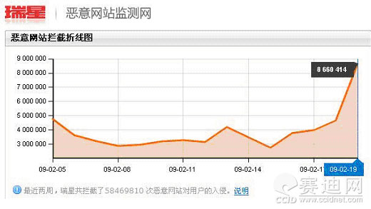 由于该类木马病毒的暴增,根据瑞星“云安全”系统的统计,仅在2月19日就截获了高达866万人次的挂马网站攻击,比前一天增加了一倍。从瑞星“恶意网站监测网(hxxp://mwm.rising.com.cn/)”上可以看到,利用该漏洞的挂马网站拦截量直线上升,已升为当时危害最严重的漏洞。