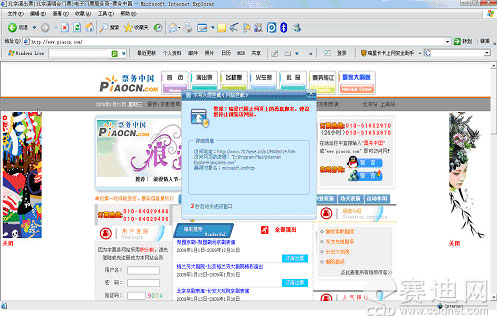 2009年1月21日,流行票务网站“票务中国(hxxp://www.piaocn.com/)”被黑客恶意挂马,网页中被植入恶意代码,代码位于域名为hxxp://####.706sese.cn的服务器上。用户一旦访问该网站订票,就会被下载大量盗号木马病毒,从而导致网游、网银或QQ账号密码丢失。当时,挂马网站706sese已经名列挂马网站排行榜第一位,一周内侵袭了144万人次网民。