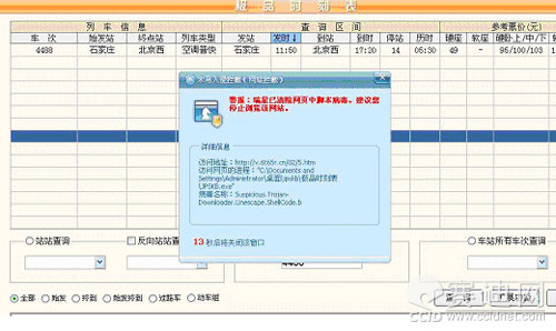被植入木马的网页为极品时刻表内嵌的广告网页,用户在使用“查询”功能之后,该软件会自动打开那个被挂马的网页。该网页中使用了多个常用软件的流行漏洞,如果用户没有做好相应的防护,很容易中毒。