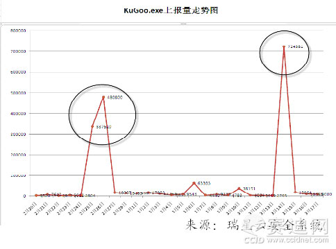从监测数据看,酷狗在2009年2月25日曾被挂马,当天截获到KuGoo.exe访问挂马网站的数量为337519,第二天2月26日为480800,那一次挂马的“寿命”长达两天,直到2月27日才清除了挂马。3月14日通过KuGoo.exe进程访问挂马网站数据量暴增,为724381,达到平时访问量的30倍之多,那次挂马持续了一天,3月15日被清除恢复正常,当天显示数量下降至18964。