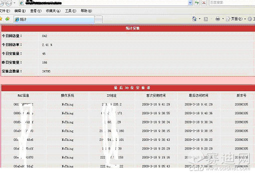 从目前该网站的数据来看,该黑客至少已经控制了34795台电脑,并以每天150台左右的速度增长。下图中的“安装总数量”就是黑客控制的染毒电脑台数;下面的“最后30台安装者”中,可以看到染毒电脑的IP、中毒时间等数据。