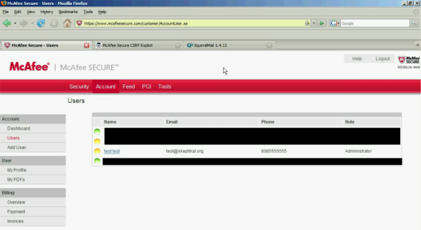 Risky.biz网站指出,使用者必须登入他们的McAfee账号,然后前往利用该弱点的恶意网站,才可能受到跨站假要求攻击。Secure Science Corporation共同创办人Lance James表示,这类利用防病毒软件商网站的攻击特别危险,因为它们能让攻击者制作内含木马程序或其他恶意软件的假安全产品,顾客则毫不怀疑地接受。