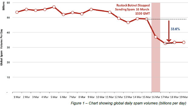据赛门铁克统计,3月15日至17日期间,全球垃圾电子邮件总量减少了33.6%。据有关报道称,微软已经对Rustock傀儡网络的运作提出了起诉。