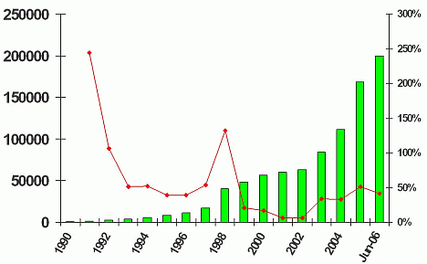 在1999-2002年间,McAfee病毒库中的病毒定义数量一直稳定在5万左右,但随后蠕虫和病毒大肆泛滥,数量急剧增加;不过与此同时,严重的病毒爆发次数显著下降:2004年中等以上级别威胁有48次,2005年降为12次,今年还没有。