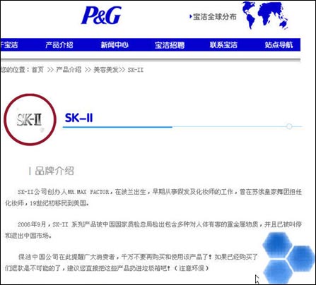 9月23日晚宝洁中国网站因SKII事件被黑.宝洁中国网站一度修复后,主页恢复正常,其产品介绍SKII页面再被黑客修改。针对的产品仍然是SKII,修改后的产品介绍语言相当恶搞。