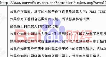 而最近,网络上不停有网友呼呼抵制家乐福,“5月8日—24日,正好是北京奥运会的前三个月,所有人都不要去家乐福购物,理由是家乐福的大股东捐巨资给达赖,支持‘藏独’。那我们现在就来抵制一下家乐福,为期与北京奥运会同长,前后17天。让他们看看中国人和中国网络的力量。请转发给你所有的手机、MSN等的联络人,并且让他们的家人一起参与,让家乐福门可罗雀17天。”《21世纪经济报道》报道称,这条短信通过手机、MSN、QQ、BBS等渠道迅速传播。短短3天之间,呼吁“五一期间不要光顾家乐福”、“抵制法国货”的帖子也遍布网络,跟帖者甚众。而家乐福就抵制事件与商务部紧急沟通,并要求员工保持克制。