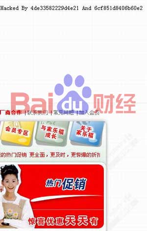 进入家乐福中国主页后,点击页面左下角的“热门促销海报”,转入促销页面。瞬间,促销页面最上方出现大片白色背景的黑色文字,号召中国消费者抵制家乐福,文字最末尾的落款为“Hacked By 4de33582229d4e21 And 6cf851d8406b60e2”,疑似黑客所为。