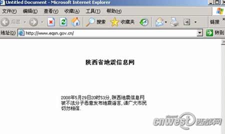 5月29日22点左右,记者登陆陕西地震局网站,已经无法看到正常的地震信息网页面。页面上只有两行简单文字,“2008年5月29日20时53分,陕西地震信息网被不法分子发布地震谣言,请广大市民切勿相信。”