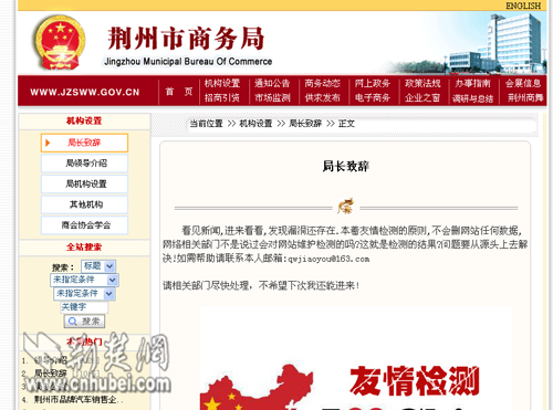 12月7日晚,荆州商务局网站继5日被黑一度修复后,其局长致辞页面再度被黑客修改。篡改页面的黑客留下邮箱称,愿意帮助该网站修复漏洞。